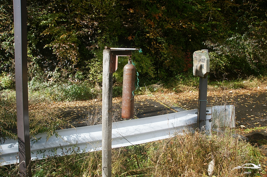 駐車場のすぐ脇には、ガスボンベを改造したクマ除けの鐘が設置されています。