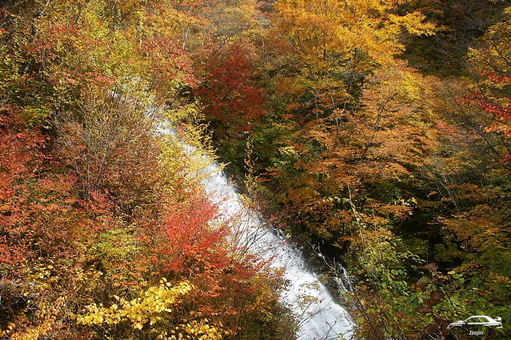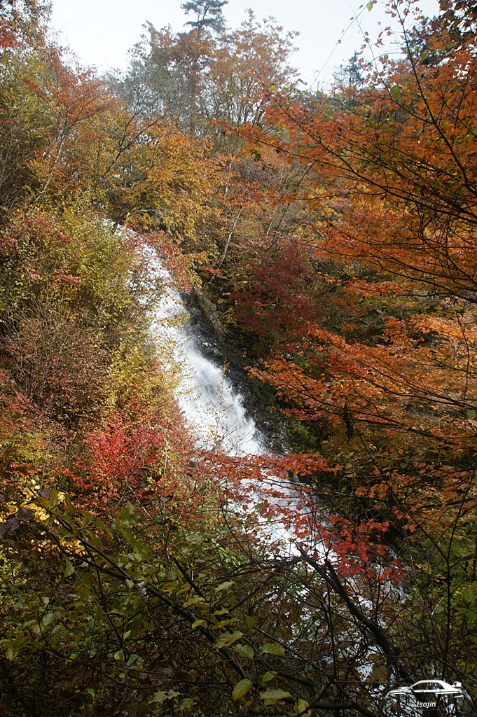 今は、紅葉に囲まれて、白く光る瀑水と紅葉のコントラストが最高です。