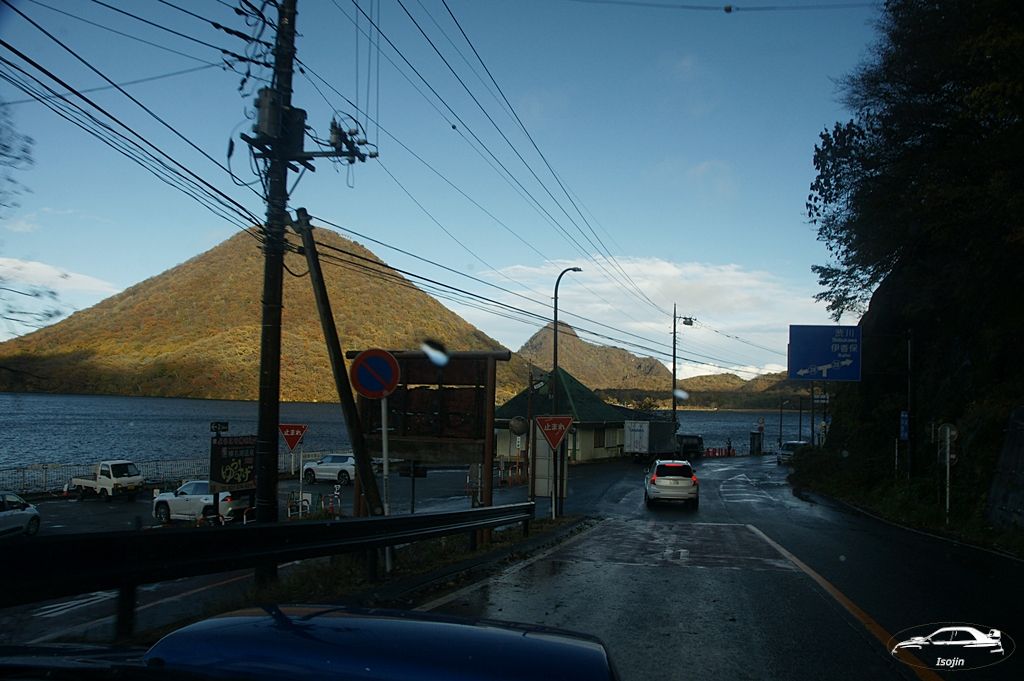 榛名湖に着くと、晴れてはいるが風が強く、路面は濡れています。