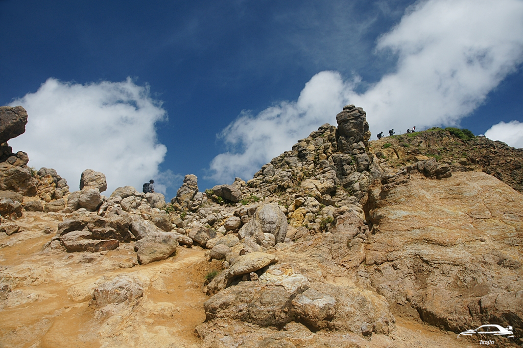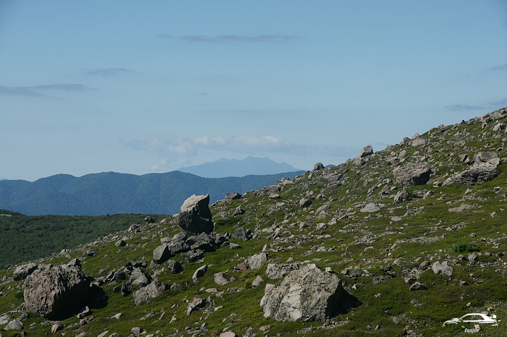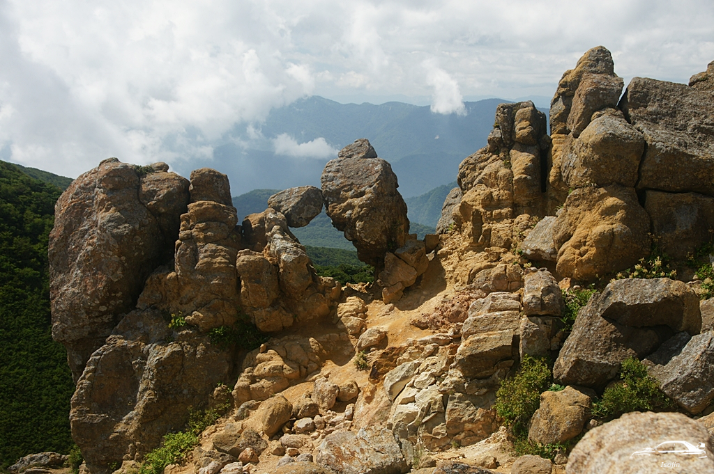 奇岩の向こうに顔おのぞかせる那須岳(茶臼岳)