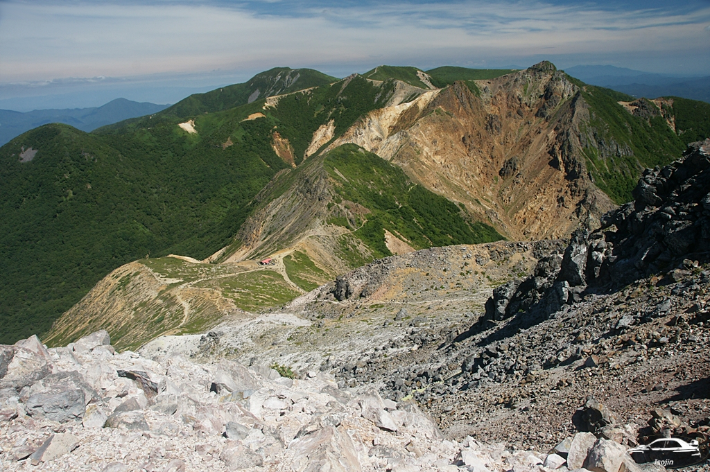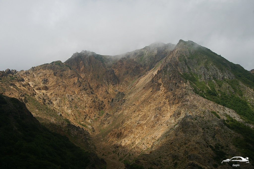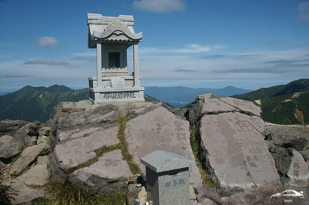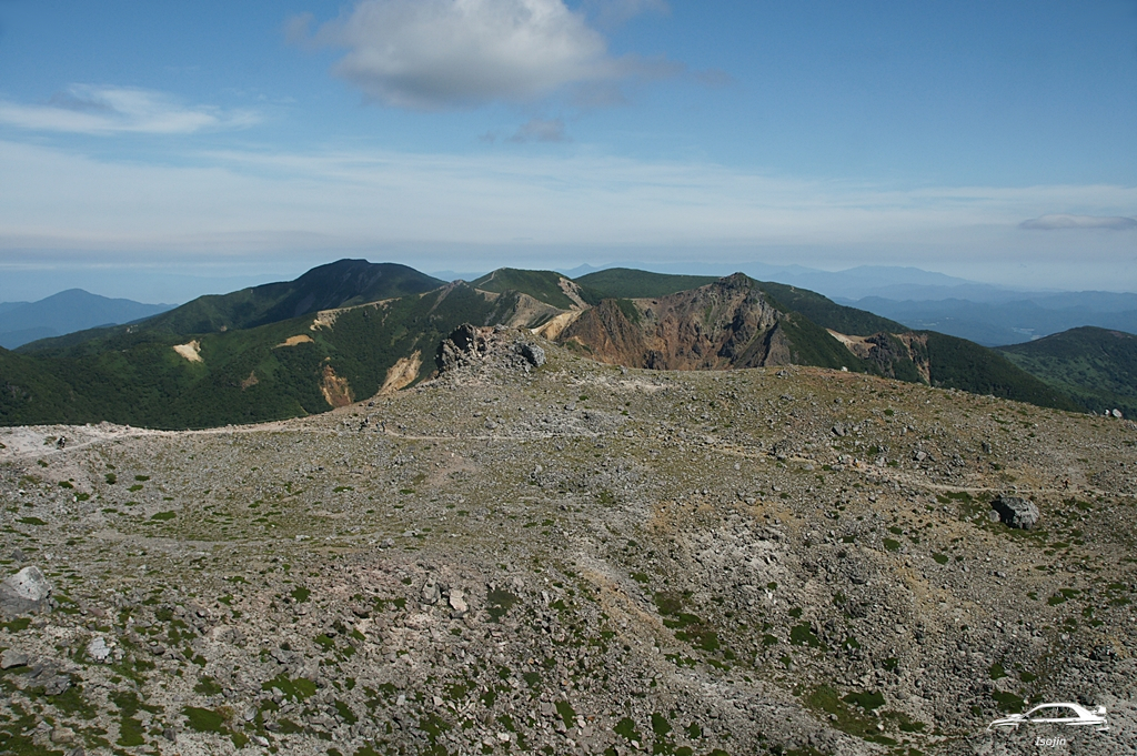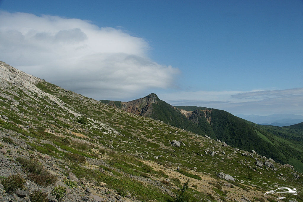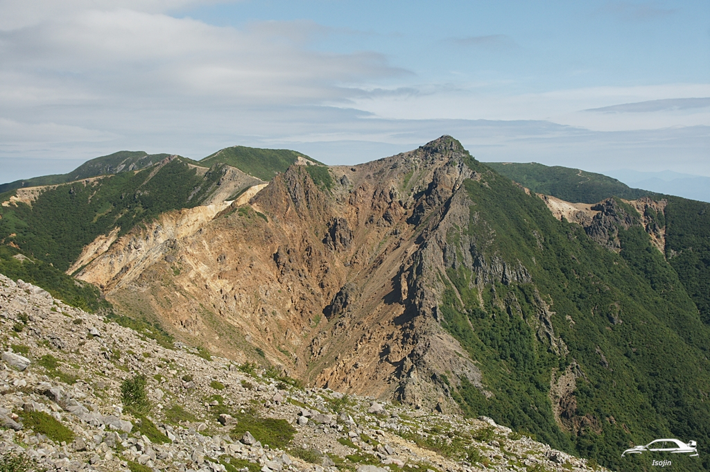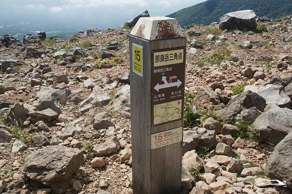 南側の茶臼岳1,915m・北側の三本槍岳1,916mを合わせて那須三山と呼ばれる。