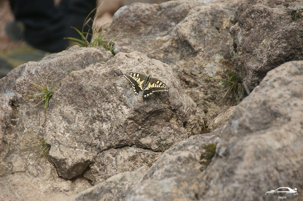 山頂にアゲハ蝶が飛んできて、岩に停まっています。