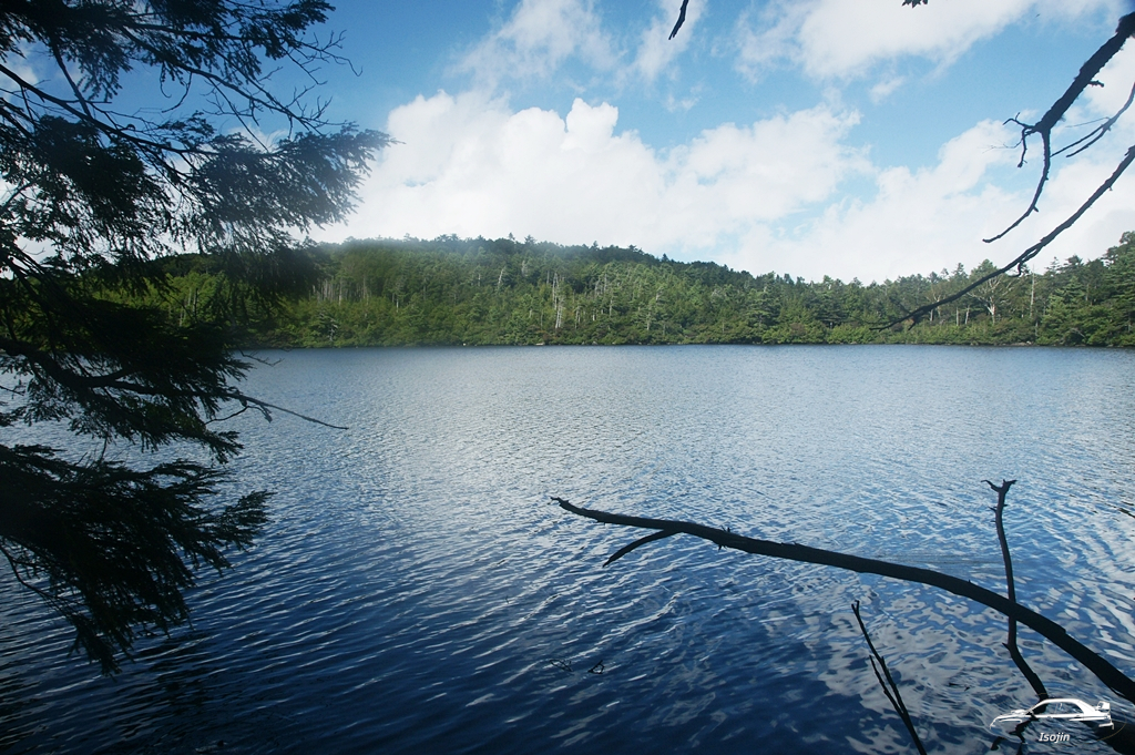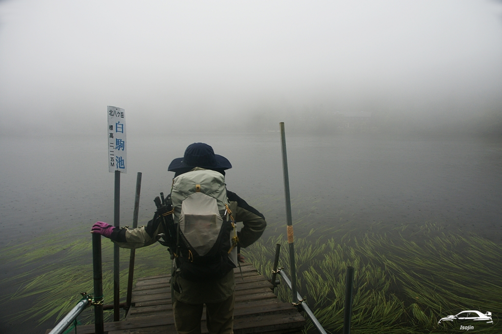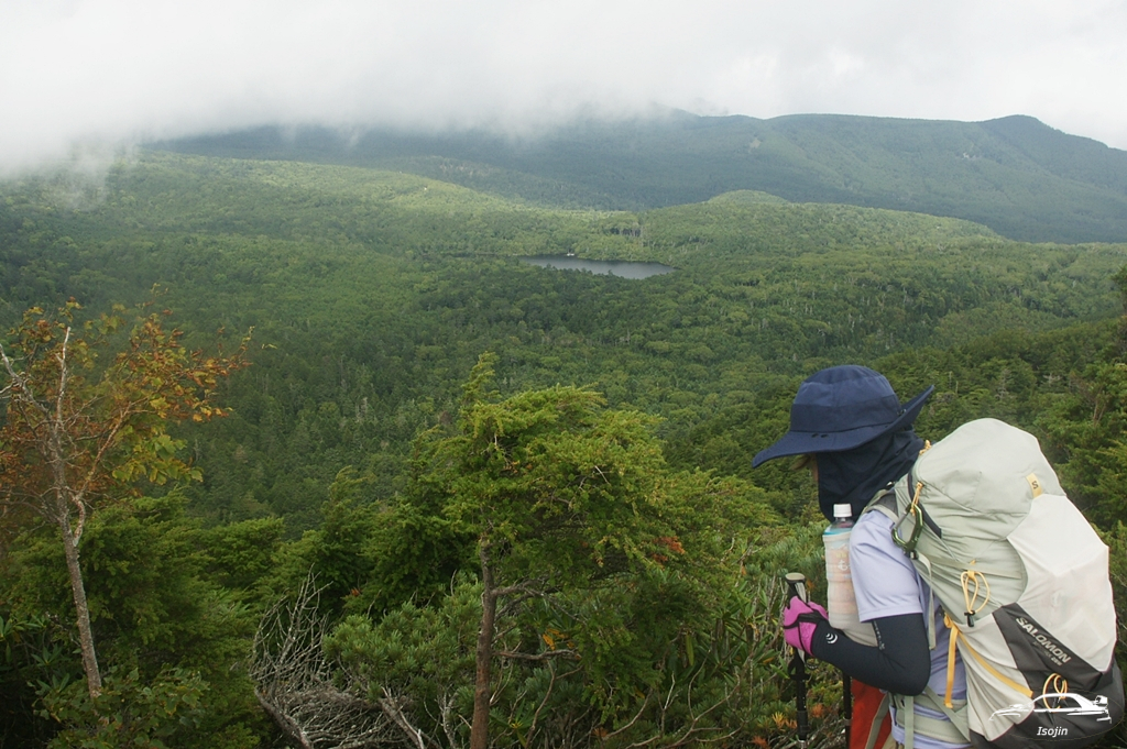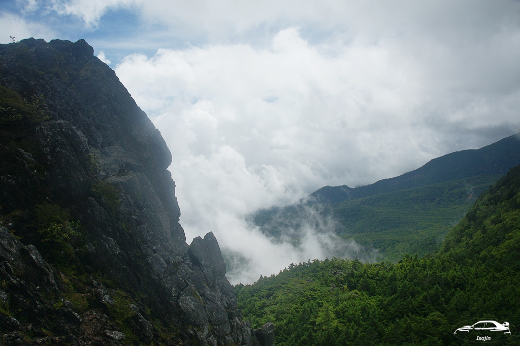 山頂の岩場から降りる際、北の方はガスが取れて、白駒の池が見えます。