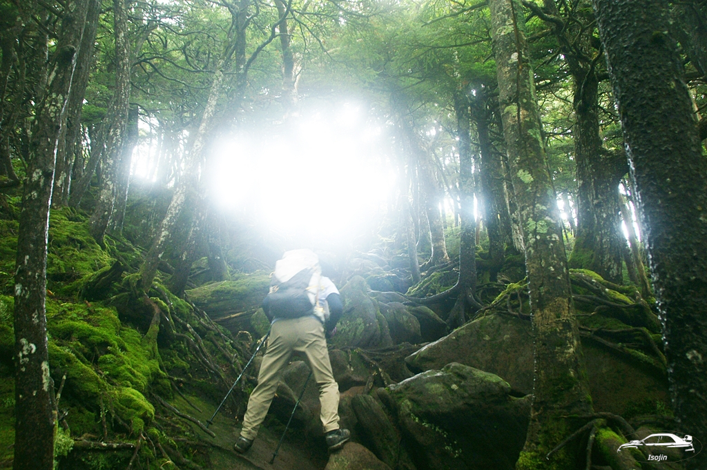 岩の急登の先から、ご来光のように明るい光が差し込んできます。