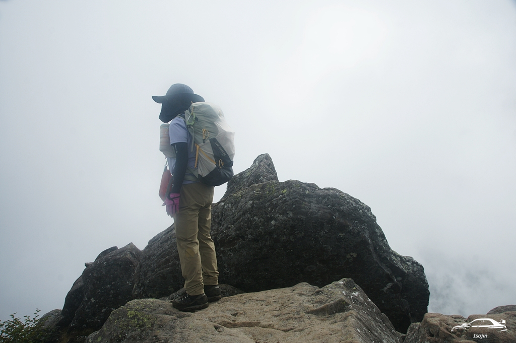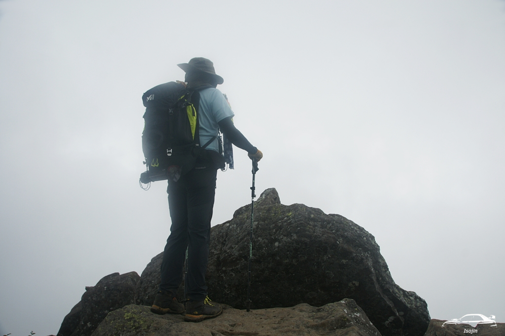 山名板は無いので、山頂付近の岩の上に立ち記念撮影。