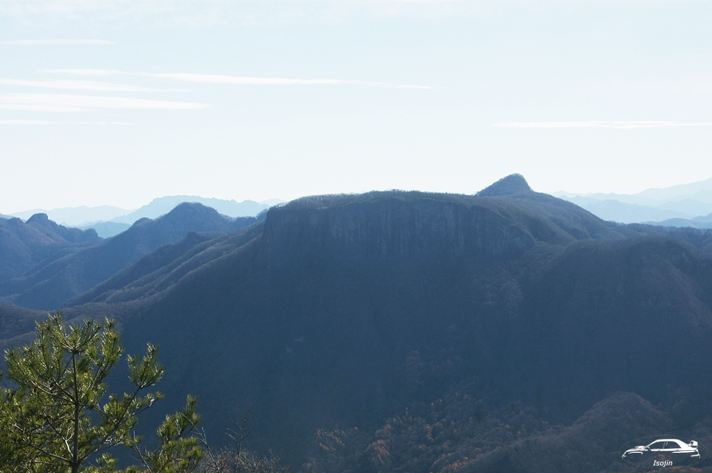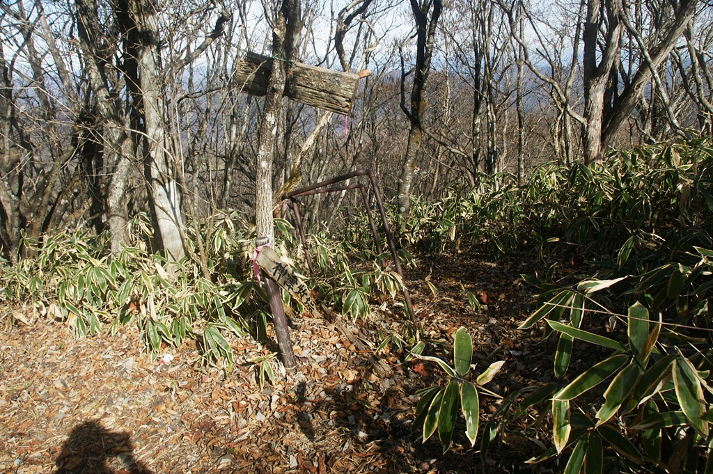 展望台からビビりながら降り、林道へ出て県境を越えて振返る。