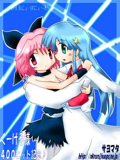 UP 2001/2/17 nknさんのサイトで400HITをとった記念に頂きました! かえるにょのキャロット&ウィンディの服入れ替えバージョンです。 元の服でのシルエットがかなり違う割に、意外としっくりきているので不思議ですね〜。 なにかこう、違った雰囲気があってよいですねぇ。キャロットが特に…なにかグッと来るものが(笑)