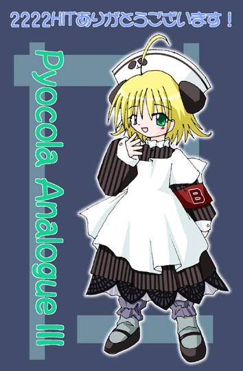 UP 2000/7/24 うちのサイトで2222HITをゲットされたすずまろさんに唐突に贈らせて頂いた絵です。 ぴよこの服はいろいろ模様があってめんどいのですが、 いざ描いてみると結構楽しかったりします。(マウスが思うように走らないとつらいですけどね)
