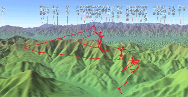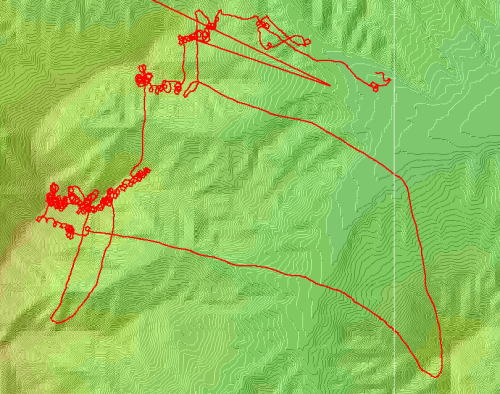 尾根線を流しながら+600まで上げてから、第二尾根へ移動する。簡単にはサーマルを見つけることができず稜線で少し苦しんだ。それでも半分上がり半分下がりを繰り返し、じわじわと高度を稼ぐ。奥の南斜面にねらいを付けて移動する。