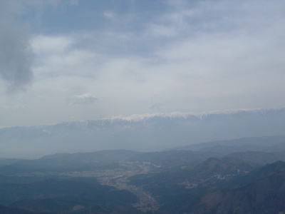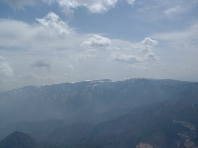 残雪の北アルプス 少しかすんでいるがとても美しい。 至福の時をしばし感じてフライトする。 |