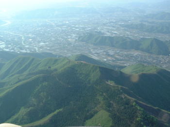 山肌よりかなり手前でサーマルに当たった、ここでも東風に押されて山頂から離れてしまう。250m程高度を戻して金城TOを目指す。