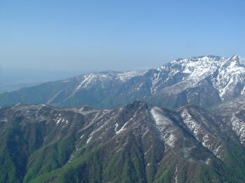 ある高さから下は新緑に覆われているが、標高の高い場所はまだしっかり雪が残っていた。