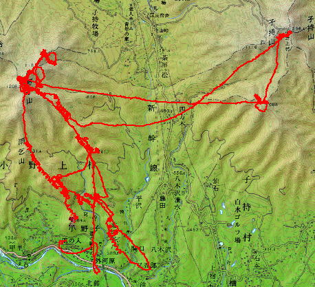 本日のフライトルート TO〜雨乞山〜小野子山〜子持前山〜子持山〜小野子山〜沖〜ゾウの檻〜LD